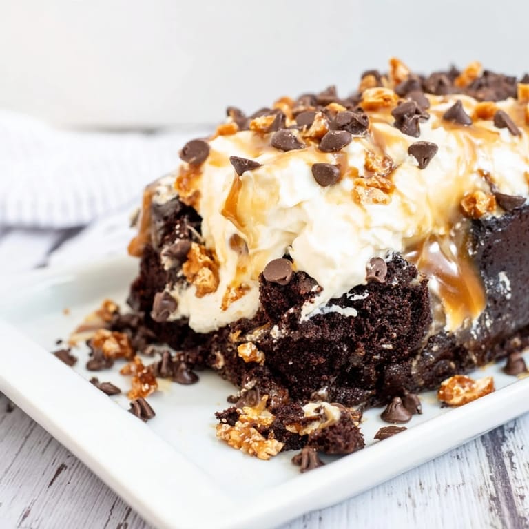 - Spread the whipped topping evenly across the cold cake like you're frosting a masterpiece. Shower it with toffee bits and chocolate chips, then give it a final drizzle of that reserved caramel sauce right before serving.